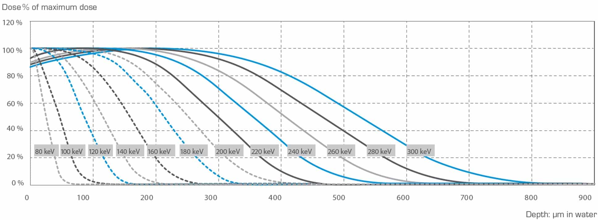 Penetration into materials of different density can be estimated by multiplying the penetration depth, found from the normalized curves, by the ratio of the density of water to the density of the material. At accelerating voltages of 150, 180 and 250 kV respective curing depth of 86, 138 and 277 g/m2 are achieved at 80 % ionisation.